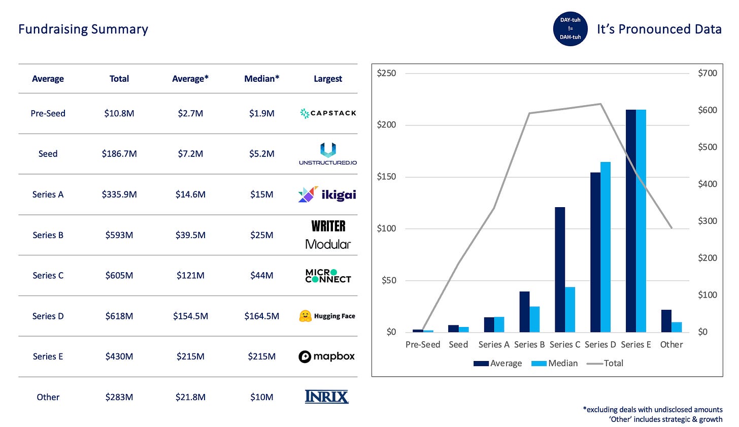 Each M&A and fundraising deal by round